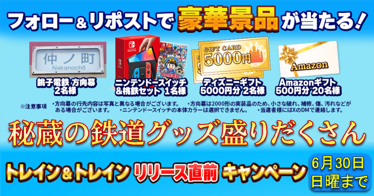 「トレイン&トレイン」公式X( @TRAIN_CEO )では、プロジェクトTのさらなる拡大を目指して、全国の鉄道事業者との合同で、秘蔵の鉄道グッズやNintendo Switch、Amazonギフト等が当たるプレゼント企画を実施します。