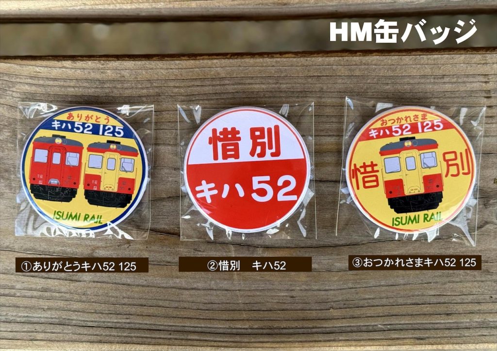 キハ52-125の営業運転終了記念として、キハ52-125グッズを数量限定で販売。キハ52-125号車引退記念イベントで使用したHMの缶バッジです! サイズ 直径約57㎜種類 3... -